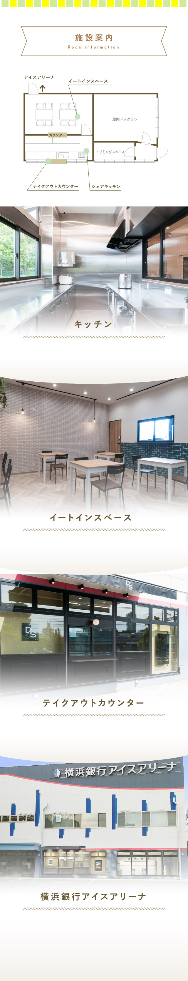 DSシェアキッチン・シェアドッグラン・シェアトリミング。横浜市神奈川区東神奈川駅、横浜銀行アイスアリーナ一階。空いた時間で飲食店スタート、キッチンカー代わりに、間借り、シェアレストラン、レンタルキッチンにも最適です。屋内ドッグランで犬・わんちゃんを遊ばせる、わんちゃんのセルフシャンプー・セルフウォッシュ、展示会、ドッグトレーナーさん・訓練士さんの間貸しなどもOK!サブスクリプションプランなど様々な用途でご利用いただけるシェアスペースとなります。